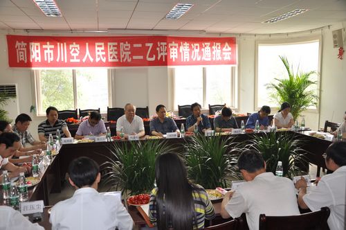 4月28日下午4点,评审通报会在医院四楼大会议室举行,简阳市卫生局梅红宇副局长,川空集团公司董事长、总经理、党委书记单金铭出席了会议。