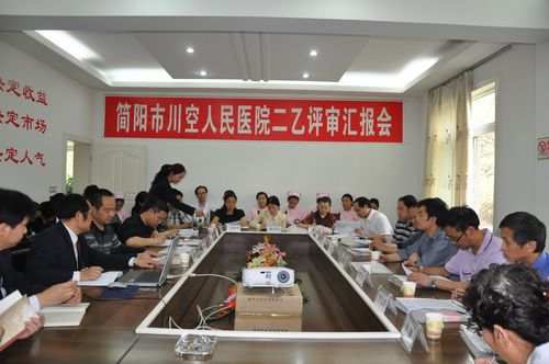 评审汇报会在医院三楼小会议室举行。专家组首先听取和观看了川空人民医院院长杨宗成所作的医院整体概况及创建工作幻灯介绍。简阳市卫生局陈泽君局长在汇报会上讲话,他说,川空人民医院是2003年底从当时的国有企业分离式改制而成,至今已有八年的民营医院、36年国有企业历史,是带有国有企业管理理念和底蕴而结出的花朵和果实。在医院发展的前期,简阳市卫生局对医院采取的是扶持政策,在医院发展过程中则采取扶持、规范并重的政策。川空人民医院在全市民营医疗机构中管理最规范,得到了市卫生局的肯定和认可。市卫生局一致认为,公立医院简阳市人民医院是一面旗帜,民营医院简阳市川空人民医院是的一面旗帜。陈局长认为,目前简阳市九家民营医院还没有一家是二级医院,川空人民医院创建二级乙等医院是简阳市卫生史上,特别是简阳民营医院发展史上的一个突破。