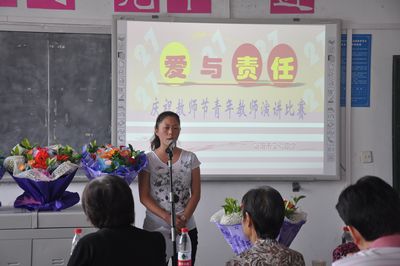 9月9日下午,实验中学为了庆祝第27个教师节,举行了“爱与责任”青年教师演讲比赛。此次比赛学校邀请到了付继闽、左永扬、杨香芬、宿聪玲等7位德高望重的退休教师做评委。演讲中,8位青年教师结合学校老师们的先进事例和自己教育教学中的亲身经历,激情诠释了“爱与责任”的真正内涵:爱心至上,勤奋工作,乐于奉献。他们精彩的演讲,引发了在座老师们的共鸣,大家都深刻感受到了作为教师的光荣与自豪,深刻感受到了教师的责任感和使命感。经过激烈角逐邓华、张艳萍、陈丽萍老师获得了演讲比赛的一等奖。
