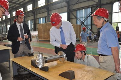 (集团)公司总工程师易希朗、副总经理计晓亮等陪同客人先后参观了换热器公司、低机公司、新冷箱车间、容器公司、机电仪公司的生产现场。观看了大型真空钎焊炉、换热器翅片生产、换热器焊接现场、五轴联动数控铣床、成型叶轮产品、空分设备生产、低温贮运设备生产、仪电控设备生产等。