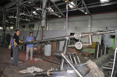 已经是晚上十一点半了,连夏天的主角知了也知道伴随凉爽的夜风放弃了对高温的抗议,但瓶管老车间的生产还未褪去热潮,张家口项目的真空管道生产制作还在紧张有序地进行着。此管道是新圣项目的配套管路,必须在8月15日发货到现场,除去进炉加温抽真空和封结装车运输的时间,时间必须限定在今天把所有的真空管路复合进炉,而且中间不能出现任何的纰漏。虽然管道只有十几件,但是每根管道都是硬骨头,每一件管路的重量可想而知。这给生产小组的复合难度也就增加了许多,平时一个人可以挪动的外管,现在必须借助行车,行车又不如人的手那么灵敏,每一点偏差都要靠点动行车来纠正。已经是深夜了,大家还在生产现场忙碌着。