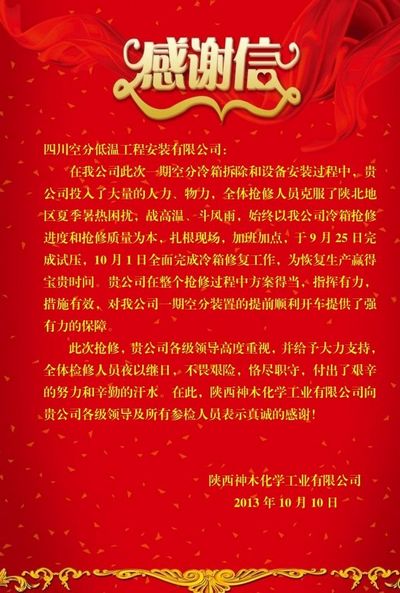 此次抢修,贵公司各级领导高度重视,并给予大力支持,全体检修人员夜以继日,不畏艰险,恪尽职守,付出了艰辛的努力和辛勤的汗水。在此,陕西神木化学工业有限公司向贵公司各级领导及所有参检人员表示真诚的感谢!