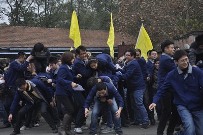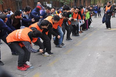 厂庆大会结束后,在专业拓展训练公司教练的指挥带领下,公司1200名员工分成12个训练方阵,每个方阵又分为A、B、C、D四支队伍分别开展训练活动。训练项目包括鼓动人心、南极浮冰、抢滩登陆、我们是最棒的团队和团队动力圈,其中前三项是小组任务,第四项是团队任务,最后一项是集体任务。所有项目都是依靠集体的力量和协调才能完成,这也是拓展训练所要达到的目的。尤其是团队动力圈项目,1000多名员工围成几个同心圆,场面宏大,充分展示了团队的力量。