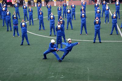 运动会举行了入场仪式,在彩旗队和鲜花队引领下,首先进场的是团体操方阵,紧随其后入场的是由公司员工组成的11个方阵。入场仪式后首先进行的是(集团)公司建厂49周年庆祝大会,董事长、总经理、党委书记单金铭发表了致辞。之后,职工运动会举行。